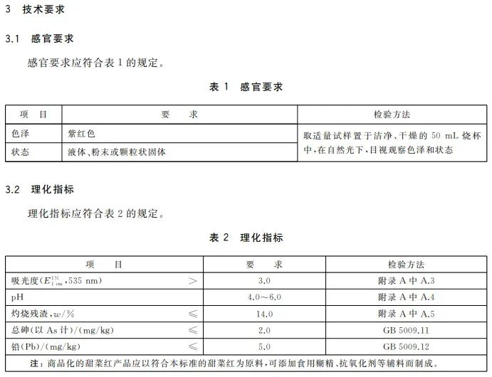 Beet red, also known as beet root red, is a food additive made by extracting red beet (seaweed head) with water through spraying and drying. It is soluble in water, slightly soluble in ethanol, and insoluble in anhydrous ethanol. The aqueous solution is red to reddish-purple, more stable at pH 3.0 - 7.0, and has the best stability at pH 4.0 - 5.0. It turns yellow under alkaline conditions, has good staining properties, and poor heat resistance. It is stable below 80 degrees and stable in acidic and neutral environments. The product quality standard " National Food Safety Standard for Food Additives Beet Red" (GB 1886.111-2015) provides sensory and physical and chemical indicators. For specific reference, see the following: