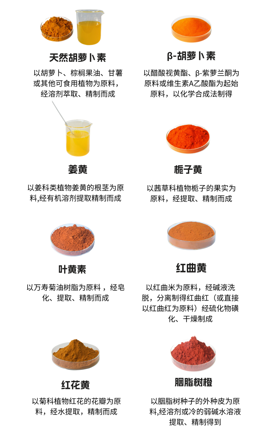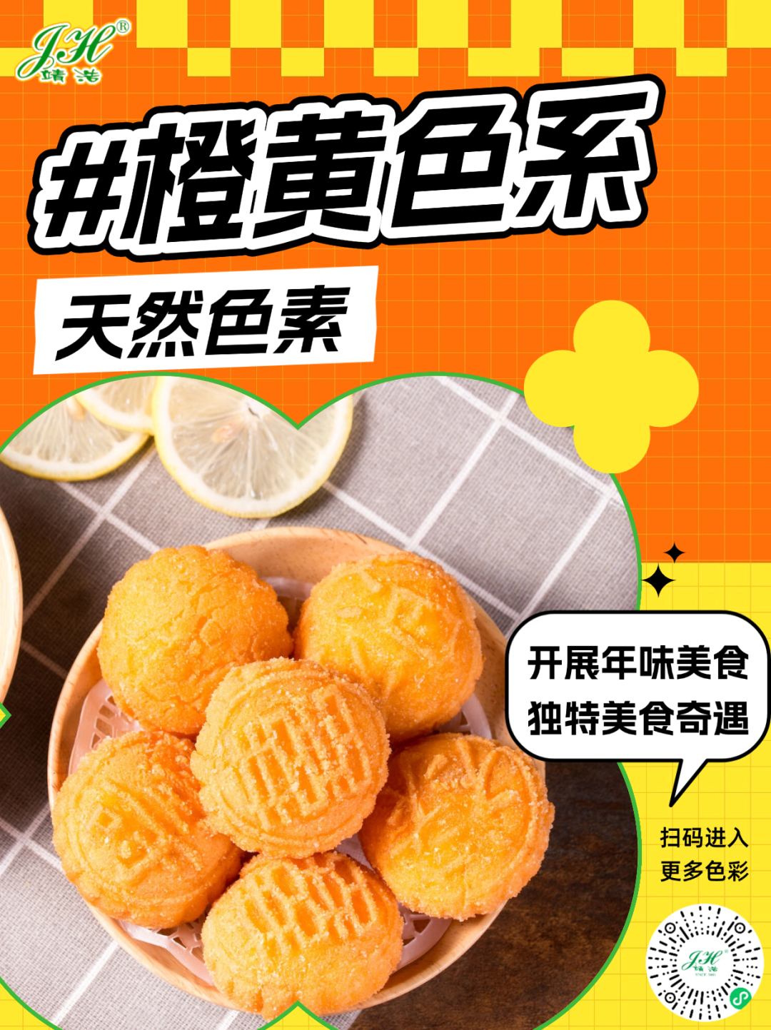 The aforementioned orange-yellow natural pigments, which are derived from natural plants, possess inherent health benefits and impart a natural allure to food products. They are extensively utilized in the food production and processing industries. Common orange-yellow foods available on the market can be enhanced with these pigments to achieve a more appealing color.