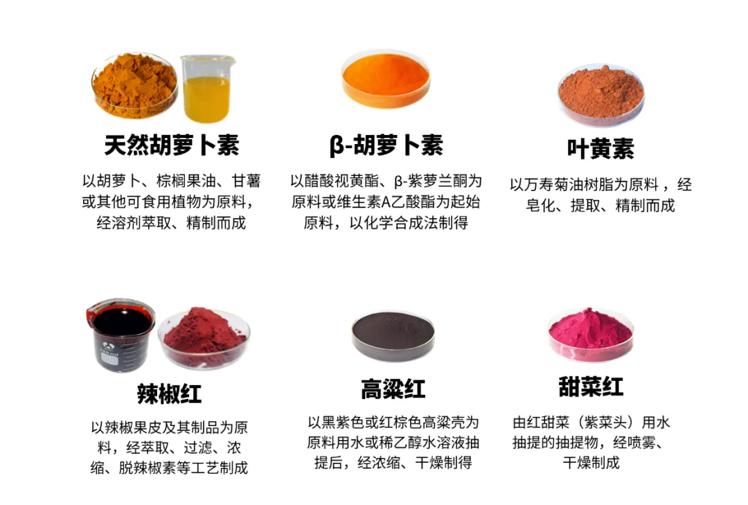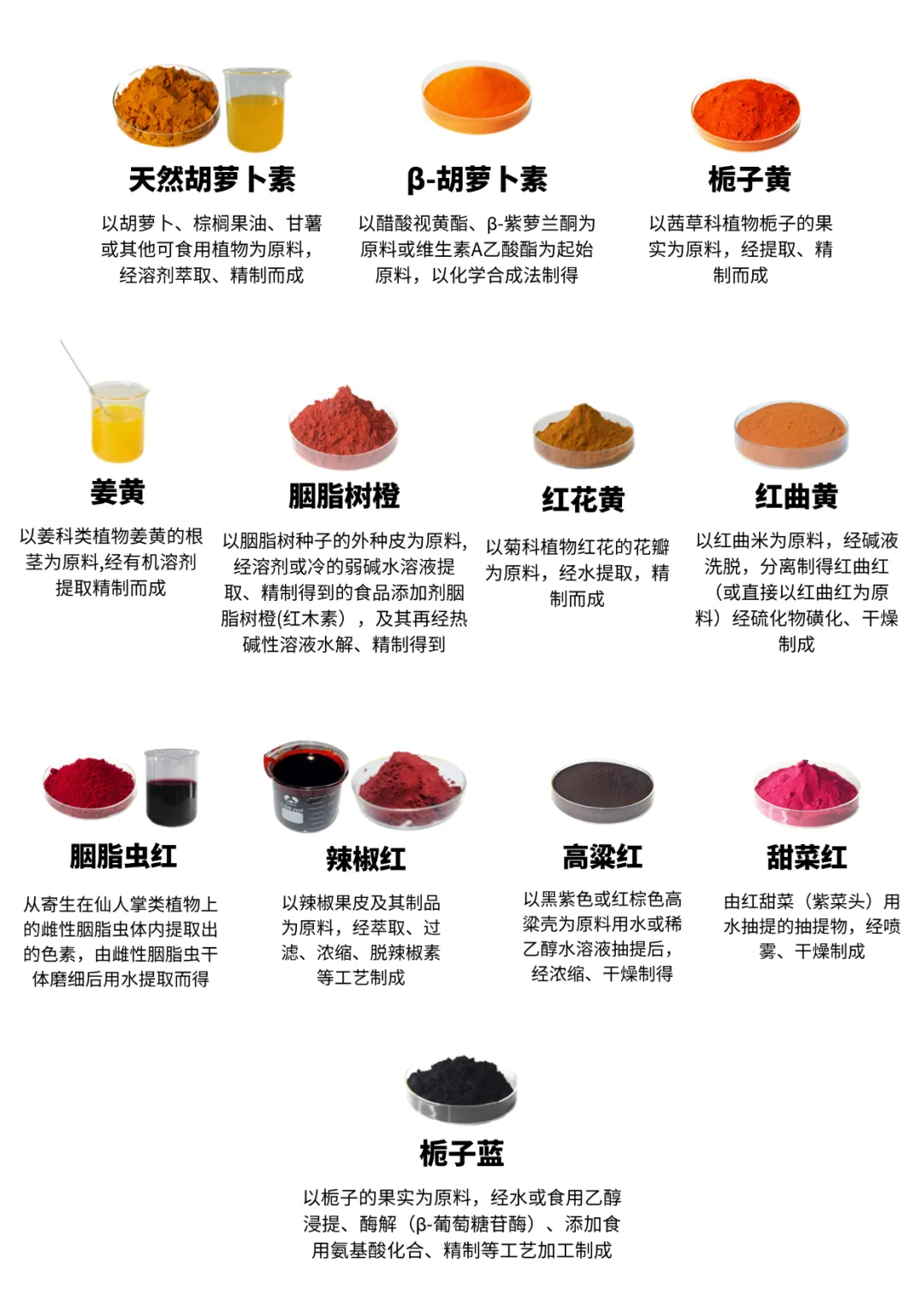 Natural carotene,β-carotene, gardenia yellow, tumeric, annatto extract, carthamins yellow, monascus yellow.